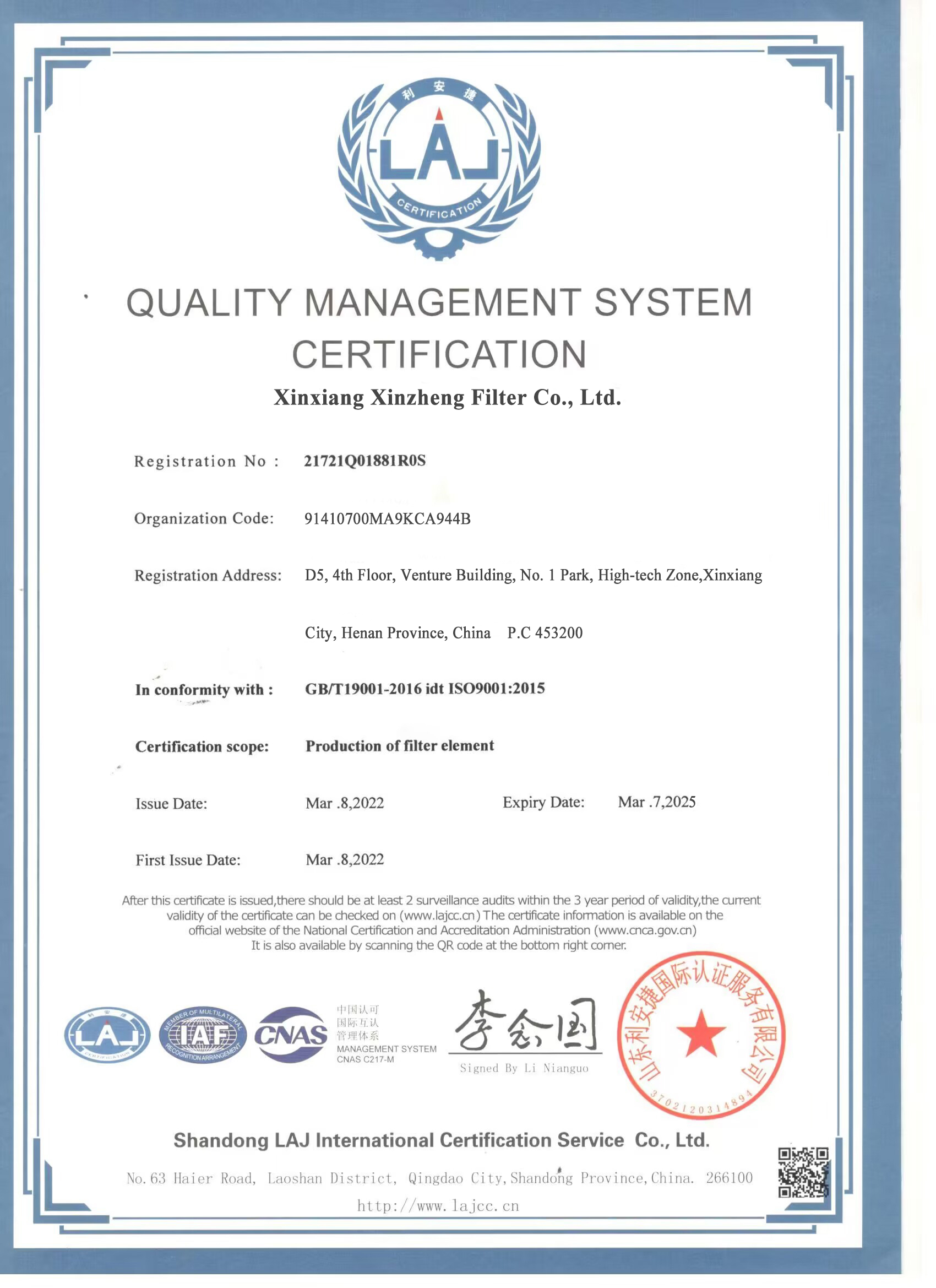 Xinzheng integrate filter scientific research, design, production, sales and service. We absorb the newest technology from at home and abroad to design filter. We set up advanced production line, and our QC system has passed ISO 9001:2008. In 2015 we built up a filter lab to make sure our finished filters have strict test before enter warehouse.
